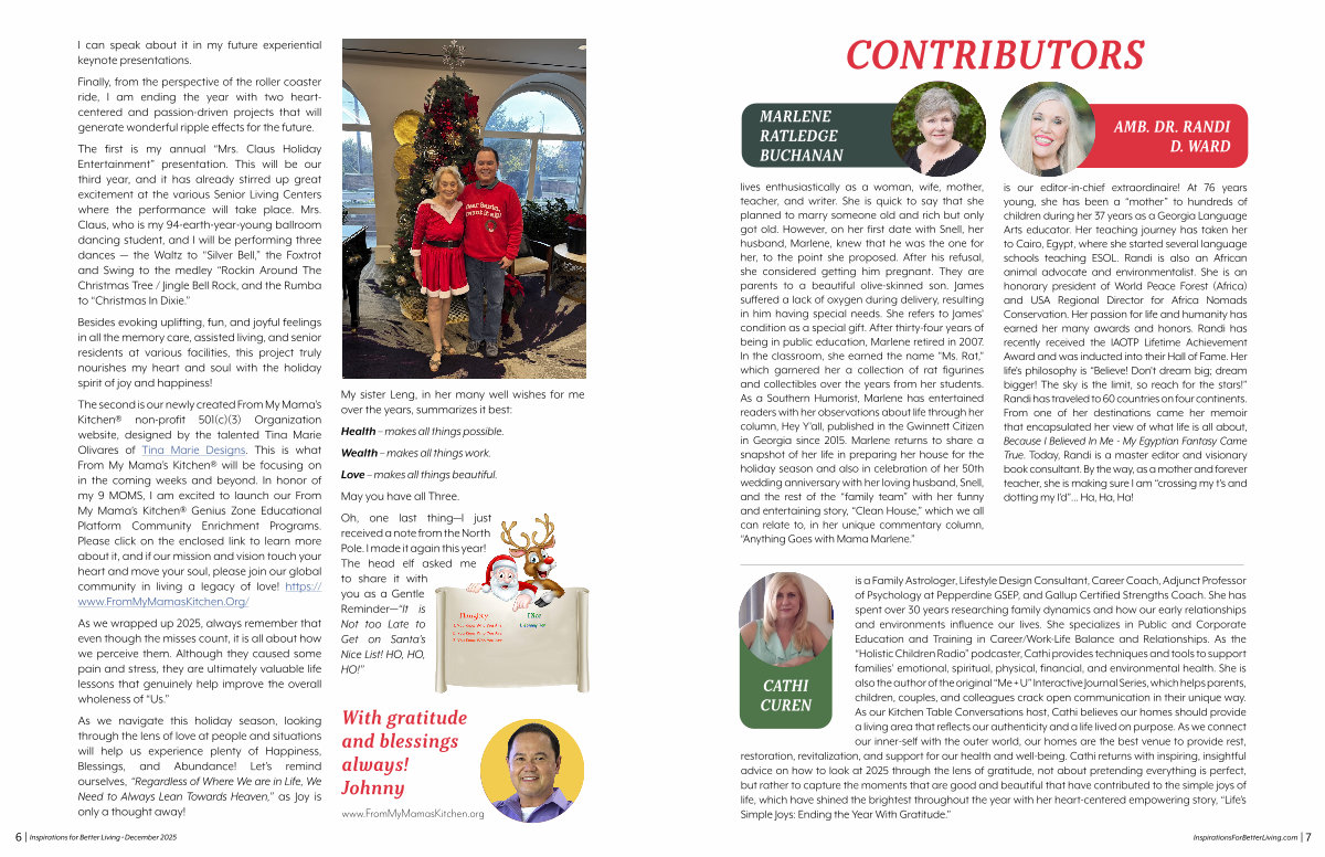 The first is my annual“ Mrs. Claus Holiday Entertainment” presentation. This will be our third year, and it has already stirred up great excitement at the various Senior Living Centers where the performance will take place. Mrs. Claus, who is my 94-earth-year-young ballroom dancing student, and I will be performing three dances— the Waltz to“ Silver Bell,” the Foxtrot and Swing to the medley“ Rockin Around The Christmas Tree / Jingle Bell Rock, and the Rumba to“ Christmas In Dixie.”