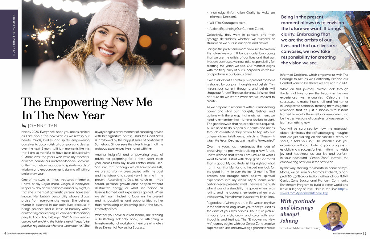 4 | Inspirations for Better Living • January 2026 always begins every moment of consoling advice with her signature phrase,“ And the Good News is …” followed by the biggest smile of confidence! Somehow, Ginger sees the silver linings in all the arduous experiences I ' ve shared with her.