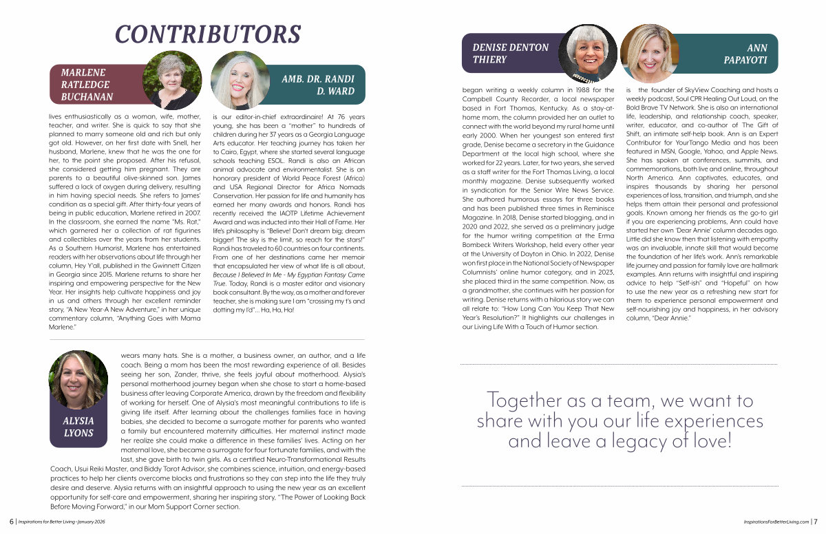 6 | Inspirations for Better Living • January 2026 wears many hats. She is a mother, a business owner, an author, and a life coach. Being a mom has been the most rewarding experience of all. Besides seeing her son, Zander, thrive, she feels joyful about motherhood. Alysia ' s personal motherhood journey began when she chose to start a home-based business after leaving Corporate America, drawn by the freedom and flexibility of working for herself. One of Alysia ' s most meaningful contributions to life is giving life itself. After learning about the challenges families face in having babies, she decided to become a surrogate mother for parents who wanted a family but encountered maternity difficulties. Her maternal instinct made her realize she could make a difference in these families ' lives. Acting on her maternal love, she became a surrogate for four fortunate families, and with the last, she gave birth to twin girls. As a certified Neuro-Transformational Results