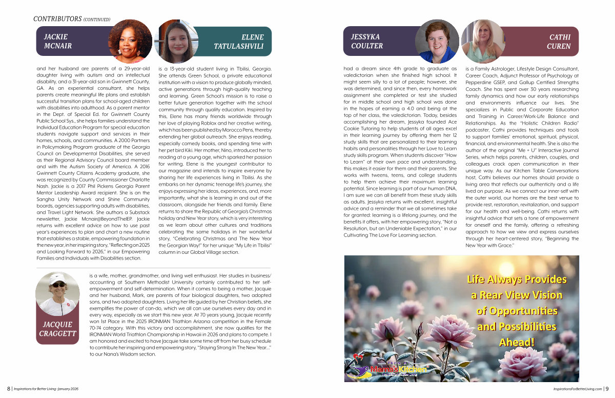 CATHI CUREN had a dream since 4th grade to graduate as valedictorian when she finished high school. It might seem silly to a lot of people; however, she was determined, and since then, every homework assignment she completed or test she studied for in middle school and high school was done in the hopes of earning a 4.0 and being at the top of her class, the valedictorian. Today, besides accomplishing her dream, Jessyka founded Ace Cookie Tutoring to help students of all ages excel in their learning journey by offering them her 12 study skills that are personalized to their learning habits and personalities through her Love to Learn study skills program. When students discover“ How to Learn” at their own pace and understanding, this makes it easier for them and their parents. She works with tweens, teens, and college students to help them achieve their maximum learning potential. Since learning is part of our human DNA, I am sure we can all benefit from these study skills as adults. Jessyka returns with excellent, insightful advice and a reminder that we all sometimes take for granted: learning is a lifelong journey, and the benefits it offers, with her empowering story,“ Not a Resolution, but an Undeniable Expectation,” in our Cultivating The Love For Learning section. is a Family Astrologer, Lifestyle Design Consultant, Career Coach, Adjunct Professor of Psychology at Pepperdine GSEP, and Gallup Certified Strengths Coach. She has spent over 30 years researching family dynamics and how our early relationships and environments influence our lives. She specializes in Public and Corporate Education and Training in Career / Work-Life Balance and Relationships. As the“ Holistic Children Radio” podcaster, Cathi provides techniques and tools to support families’ emotional, spiritual, physical, financial, and environmental health. She is also the author of the original“ Me + U” Interactive Journal Series, which helps parents, children, couples, and colleagues crack open communication in their unique way. As our Kitchen Table Conversations host, Cathi believes our homes should provide a living area that reflects our authenticity and a life lived on purpose. As we connect our inner-self with the outer world, our homes are the best venue to provide rest, restoration, revitalization, and support for our health and well-being. Cathi returns with insightful advice that sets a tone of empowerment for oneself and the family, offering a refreshing approach to how we view and express ourselves through her heart-centered story,“ Beginning the New Year with Grace.”