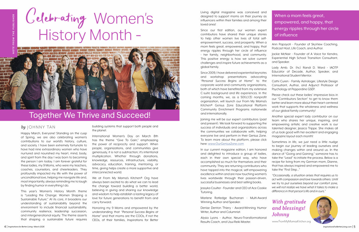 Since our first edition, our women expert contributors have shared their unique stories to help other women live lives of total selfempowerment, success, and prosperity. When a mom feels great, empowered, and happy, that energy ripples through her circle of influence- her family, neighborhood, and community. This positive energy is how we solve current challenges and inspire future achievements as a global family.