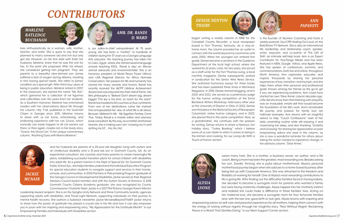 6 | Inspirations for Better Living • November 2025 and her husband are parents of a 29-year-old daughter living with autism and an intellectual disability and a 31-year-old son in Gwinnett County, GA. As an experiential consultant, she coaches and trains parents to create meaningful life plans, establishing successful transition plans for school children with disabilities into adult life. As a parent mentor in the Dept of Special Ed. for Gwinnett County Public School Sys., she helps families understand the Individual Education Program for special education students to navigate support and services in their homes, schools, and communities. A 2000 Partners in Policymaking Program graduate of the Georgia Council on Developmental Disabilities, Jackie served as their Regional Advisory Council board member and with the Autism Society of America. A 2016 Gwinnett County Citizens Academy graduate, she was recognized by County Commissioner Charlotte Nash. Jackie is a 2017 Phil Pickens Georgia Parent Mentor