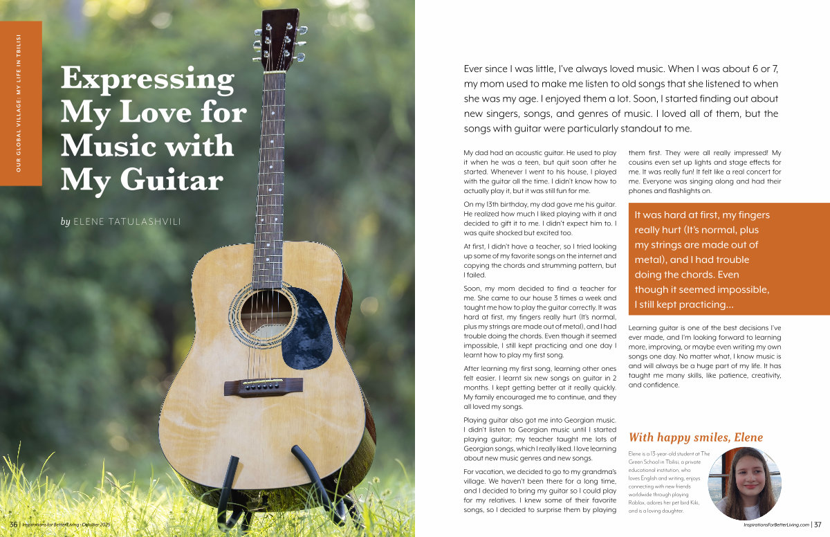 Soon, my mom decided to find a teacher for me. She came to our house 3 times a week and taught me how to play the guitar correctly. It was hard at first, my fingers really hurt (It’s normal, plus my strings are made out of metal), and I had trouble doing the chords. Even though it seemed impossible, I still kept practicing and one day I learnt how to play my first song.