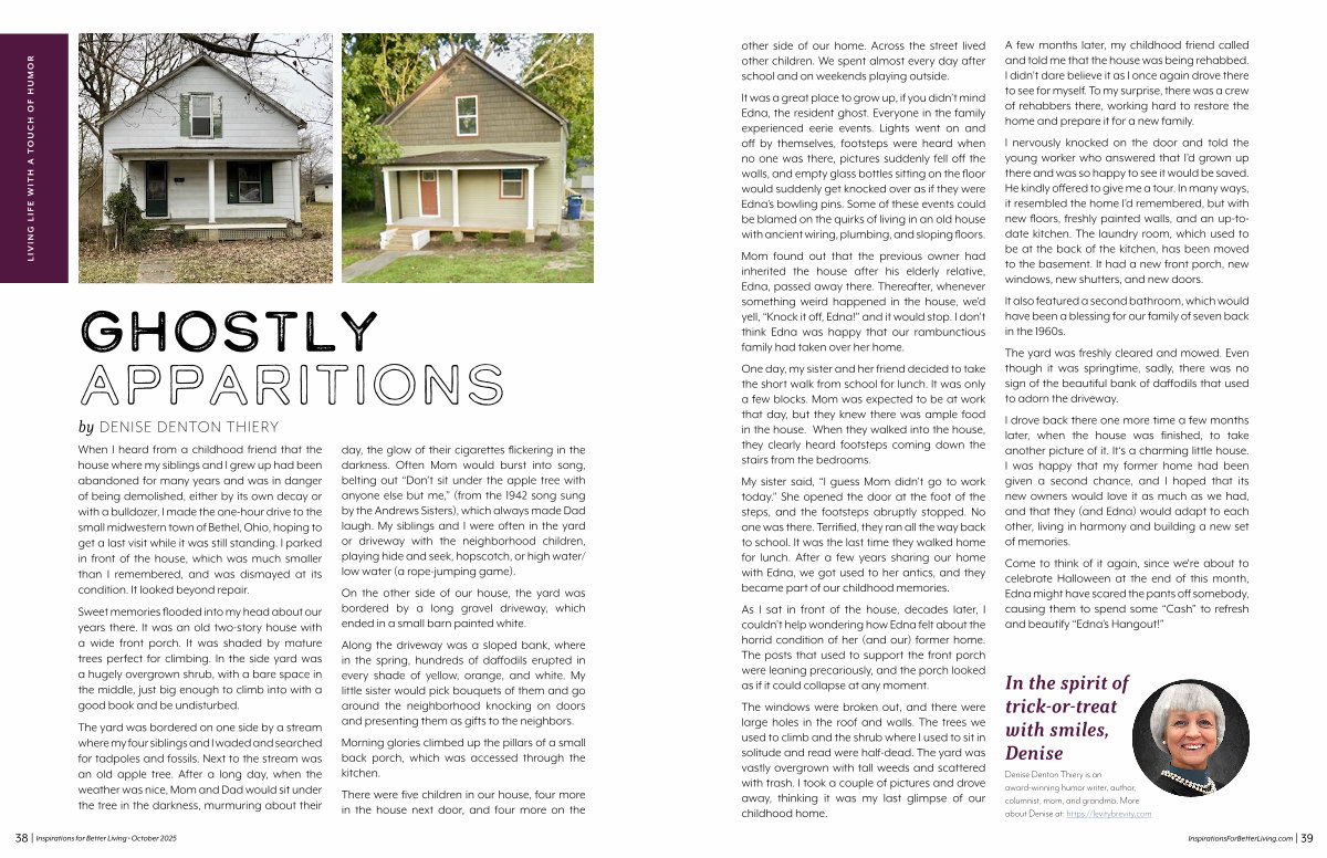 My sister said, "I guess Mom didn't go to work today." She opened the door at the foot of the steps, and the footsteps abruptly stopped. No one was there. Terrified, they ran all the way back to school. It was the last time they walked home for lunch. After a few years sharing our home with Edna, we got used to her antics, and they became part of our childhood memories.