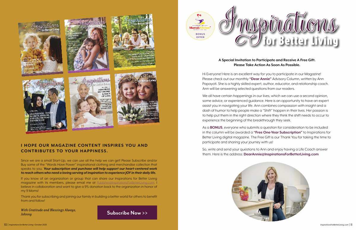 If you know of an organization or group that can share our Inspirations for Better Living magazine with its members, please email me at Publisher @ InspirationsForBetterLiving. com. I believe in collaboration and want to give a 9 % donation back to the organization in honor of my 9 Moms!