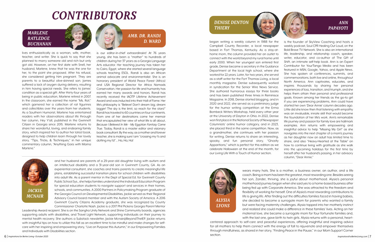 ANN PAPAYOTI began writing a weekly column in 1988 for the Campbell County Recorder, a local newspaper based in Fort Thomas, Kentucky. As a stay-athome mom, the column provided her an outlet to connect with the world beyond my rural home until early 2000. When her youngest son entered first grade, Denise became a secretary in the Guidance Department at the local high school, where she worked for 22 years. Later, for two years, she served as a staff writer for the Fort Thomas Living, a local monthly magazine. Denise subsequently worked in syndication for the Senior Wire News Service. She authored humorous essays for three books and has been published three times in Reminisce Magazine. In 2018, Denise started blogging, and in 2020 and 2022, she served as a preliminary judge for the humor writing competition at the Erma Bombeck Writers Workshop, held every other year at the University of Dayton in Ohio. In 2022, Denise won first place in the National Society of Newspaper Columnists’ online humor category, and in 2023, she placed third in the same competition. Now, as a grandmother, she continues with her passion for writing. Denise returns to share an interesting, spooky, and fun personal story,“ Ghostly Apparitions,” which is perfect for this edition as we celebrate Halloween at the end of the month, for our Living Life With a Touch of Humor section. is the founder of SkyView Coaching and hosts a weekly podcast, Soul CPR Healing Out Loud, on the Bold Brave TV Network. She is also an international life, leadership, and relationship coach, speaker, writer, educator, and co-author of The Gift of Shift, an intimate self-help book. Ann is an Expert Contributor for YourTango Media and has been featured in MSN, Google, Yahoo, and Apple News. She has spoken at conferences, summits, and commemorations, both live and online, throughout North America. Ann captivates, educates, and inspires thousands by sharing her personal experiences of loss, transition, and triumph, and she helps them attain their personal and professional goals. Known among her friends as the go-to girl if you are experiencing problems, Ann could have started her own‘ Dear Annie’ column decades ago. Little did she know then that listening with empathy was an invaluable, innate skill that would become the foundation of her life’ s work. Ann’ s remarkable life journey and passion for family love are hallmark examples. Ann returns with empowering and insightful advice to help“ Missing My Girl” as she navigates into the next chapter of a mom’ s journey as her daughter now an adult has limited time to share, and also“ Heavy-Hearted at the Table” on how to continue living with gratitude as she walk into the upcoming holidays for the first time by herself after her husband’ s passing, in her advisory column,“ Dear Annie.”
